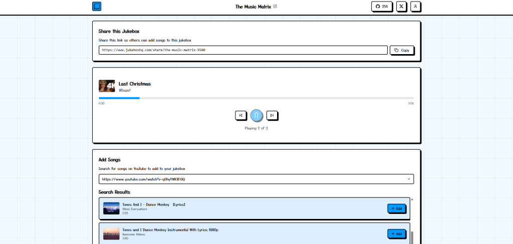 Musikstücke werden über ein Suchfeld eingepflegt. Es kann entweder direkt der YouTube-Link eingegeben oder ein bestimmter Song gesucht werden. Die Musik wird dann automatisch getaktet abgespielt, sodass jede Stimme Gehör findet – im Sinne eines fairen Ablaufs.
