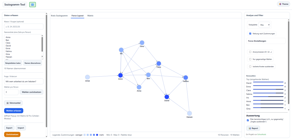 Das neue Soziogramm-Tool auf Schooltools wurde von Helmut Pecher entwickelt und bietet Lehrpersonen eine einfache und zugleich vielseitige Möglichkeit, Beziehungsgeflechte innerhalb einer Klasse oder Lerngruppe sichtbar zu machen.