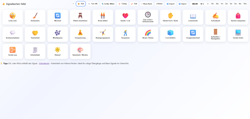 Die Signalkarten-Tafel wurde von Helmut Pecher für Schooltools entwickelt und ist ein einfaches, aber wirkungsvolles webbasiertes Tool, Unterrichtsphasen klar, ruhig und visuell zu steuern. Statt mündliche Ansagen zu machen, kann die Lehrperson über deutlich erkennbare Symbolkarten anzeigen, was gerade ansteht: Ruhe, Schreibzeit, Teamarbeit, Lesestunde oder Pausenbeginn.