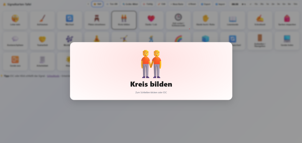 Mit einem Klick auf das jeweils passende Symbol wird die Karte groß angezeigt: Das Signal füllt den Bildschirm, ist für alle gut sichtbar und kann – je nach Einstellung – automatisch mit Ablauf eines Timers wieder ausgeblendet werden. So entsteht ein klarer visueller Fokus, der selbst in unruhigen Situationen Orientierung gibt, ohne dass die Lehrperson laut werden muss.