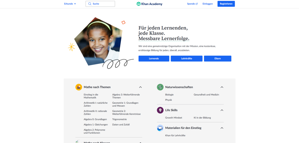 Die Khan Academy ist eine gemeinnützige Bildungsplattform, die kostenfreie Online-Lernangebote für Lernende, Lehrkräfte und Eltern bereitstellt. Ziel der Organisation ist es, qualitativ hochwertige Bildung für alle zugänglich zu machen – unabhängig von Herkunft, Wohnort oder finanziellen Möglichkeiten.