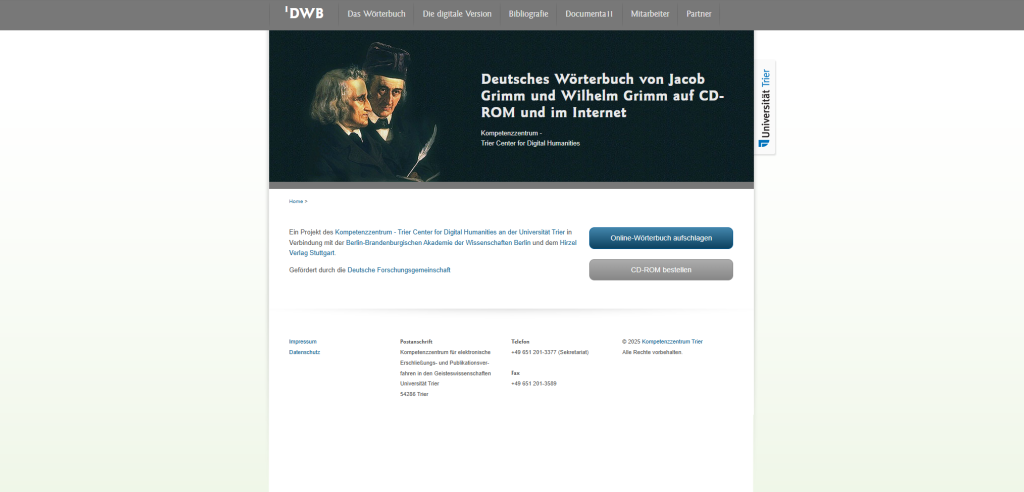 Das Digitale Wörterbuch der Gebrüder Grimm (DWB) der Universität Trier ist ein umfangreiches, frei zugängliches Online-Wörterbuch, das auf den Grundlagen des Deutschen Wörterbuchs von Jacob und Wilhelm Grimm aufbaut. Es vereint historische und gegenwärtige Sprachdaten in einer modernen digitalen Umgebung und ermöglicht differenzierte Einblicke in die Entwicklung und den Gebrauch deutscher Wörter. Neben Bedeutungsangaben, Belegen und Wortherkunft bietet das Portal auch statistische Informationen zu Wortfrequenzen sowie umfangreiche Korpusdaten, mit denen Sprachwandel sichtbar gemacht werden kann.