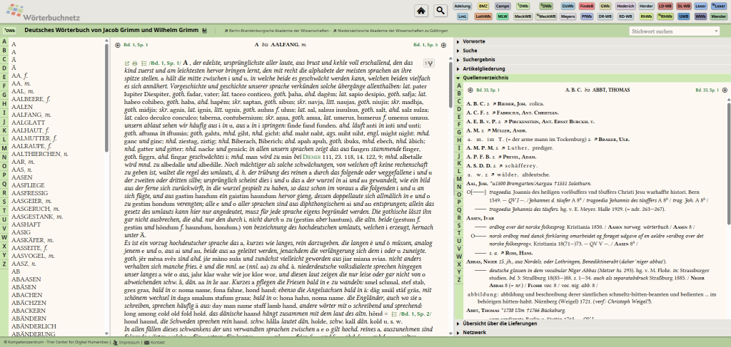 Zu den dort abrufbaren Wörterbüchern zählen u.a. Wörterbücher zu Mittelhochdeutsch, Althochdeutsch, Goethe sowie zahlreiche regionalsprachliche Wörterbücher.