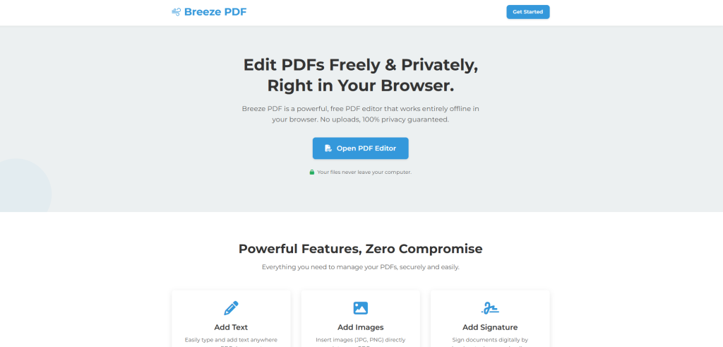 Breeze PDF ist ein kostenfreier PDF-Editor, der im Browser ausgeführt wird und keine Installation erfordert. Es bleiben sämtliche Daten lokal auf dem Gerät, die Dateien werden nicht auf externe Server hochgeladen, sondern ausschließlich im Browser verarbeitet.