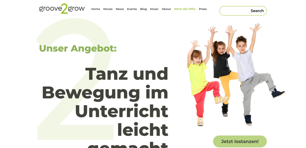 groove2grow ist eine digitale Plattform, die Lehrpersonen Unterrichtsmaterialien im Bereich Tanz und Bewegung zur Verfügung stellt. Das Angebot richtet sich an Schulen unterschiedlicher Schulstufen und zielt darauf ab, Bewegung als regelmäßigen Bestandteil des Lernalltags nutzbar zu machen.