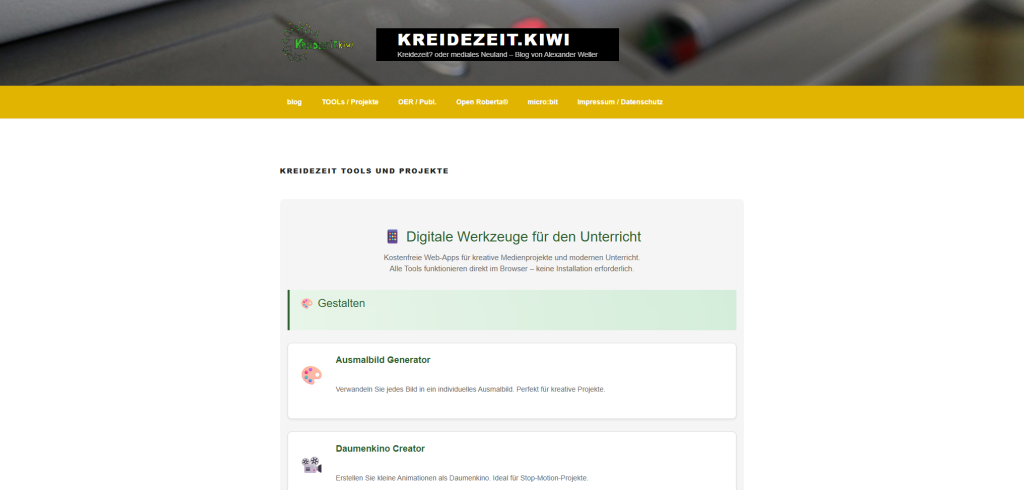Die Webseite Kreidezeit von Alexander Wellerbietet in ihrem Bereich Bereich Tools und Projekte eine umfangreiche Sammlung an nützlichen Programmen und hilfreichen Ressourcen, die den Unterrichtsalltag erleichtern, digitale Arbeitsabläufe unterstützen und kreative Unterrichtsideen fördern.