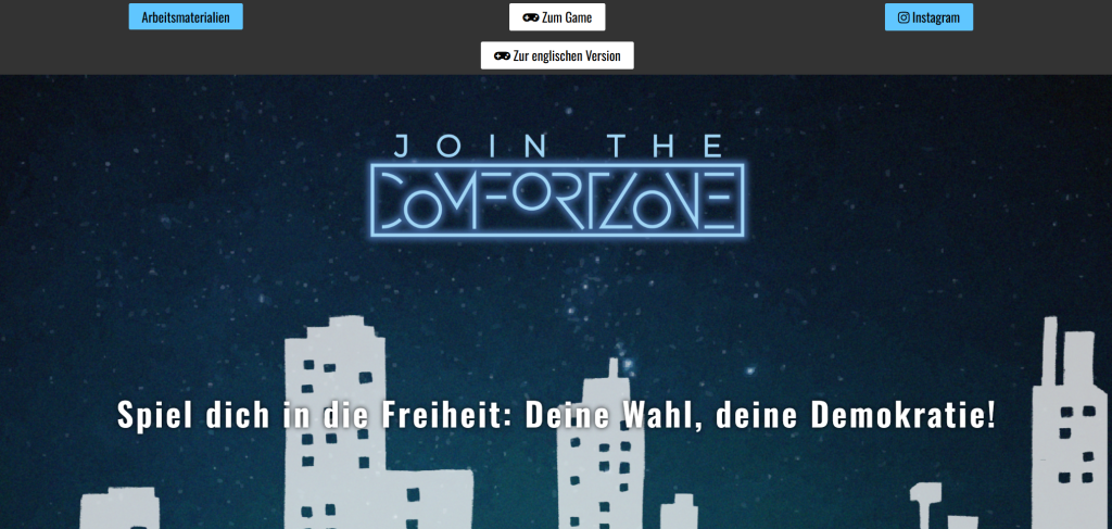 „Join the Comfortzone“ ist ein kostenloses, browserbasiertes Spiel, das Überwachung, soziale Kontrolle und die Wirkungsweise autoritärer Systeme thematisiert. Es eignet sich daher für die Auseinandersetzung mit Demokratie, Machtstrukturen, individueller Freiheit und Verantwortung. Durch die erzählerische Struktur ermöglicht das Spiel einen niedrigschwelligen Zugang zu komplexen gesellschaftlichen Fragen und fördert die Reflexion über eigenes Handeln.