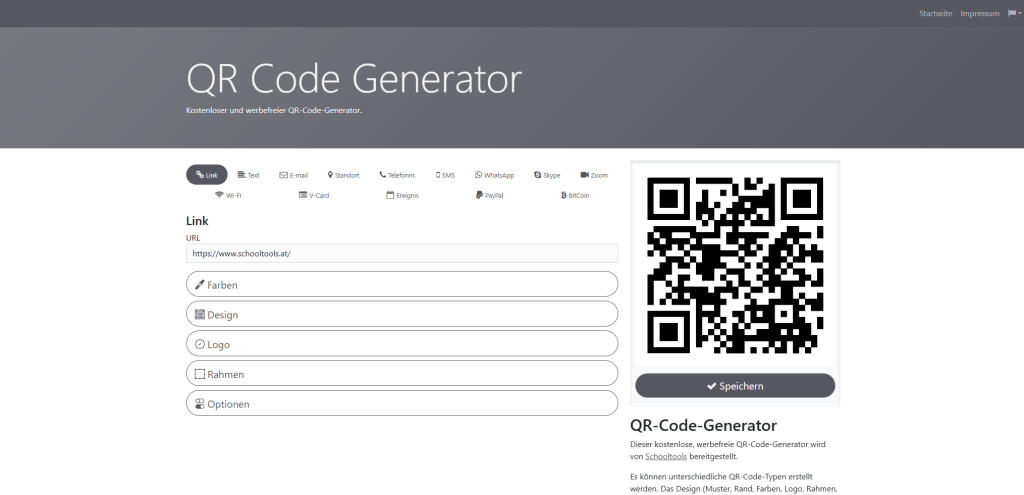 Der von Schooltools bereitgestellte Online QR-Code-Generator bietet eine einfache und zuverlässige Möglichkeit, QAR-Codes zu erstellen und so digitale Inhalte schnell in den Unterricht einzubinden. Mit wenigen Eingaben lassen sich QR-Codes aus Weblinks, Texten, E-Mails, Telefonnummern oder WLAN-Zugangsdaten generieren. Dazu werden folgende Funktionen geboten: