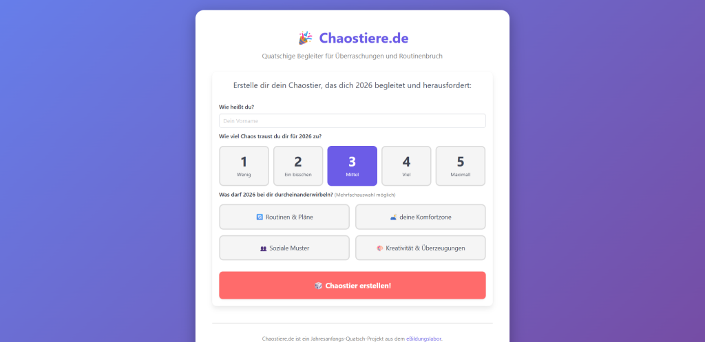 Chaostiere ist ein von Nele Hirsch gestaltetes frei zugängliches, webbasiertes Tool mit spielerischem Charakter, das zur Reflexion über Veränderung, Routinen und persönliche Herausforderungen anregt. Nutzende erstellen durch einfache Eingaben wie Namen, das gewünschte Chaos-Level und Bereiche für Chaos auswählen. ein individuell generiertes „Chaostier“, das symbolisch für unerwartete Situationen, Störungen von Gewohnheiten und neue Impulse steht.