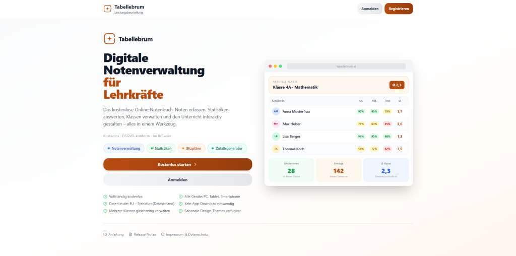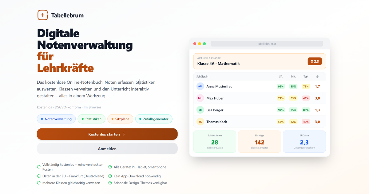 Tabellebrum ist ein von Kai Hebein konzipiertes, kostenloses Online-Tool zur digitalen Notenverwaltung für Lehrkräfte. Die Anwendung ist direkt im Browser nutzbar und erfordert keine Installation. Noten können damit einfach erfasst, Durchschnittswerte automatisch berechnet und mehrere Klassen parallel verwaltet werden.