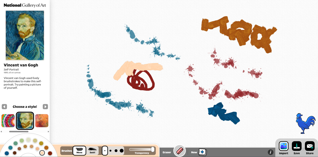 Mit Paint ’n’ Play der National Gallery of Art können Lernende direkt im Browser eigene digitale Kunstwerke gestalten. Die Anwendung funktioniert wie ein einfach zugängliches Malprogramm, verbindet das digitale Zeichnen aber mit Kunstbetrachtung. Zu Beginn wählen die Nutzenden ein Kunstwerk beziehungsweise eine künstlerische Vorlage aus der Sammlung der National Gallery aus, etwa inspiriert von Vincent van Gogh oder Alma Thomas. Danach öffnet sich eine digitale Zeichenfläche, auf der mit passenden Farben, Pinseln und Pinselspuren gearbeitet werden kann.